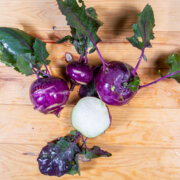 Ce chou, parfois appelé chou boule, affiche différentes couleurs allant du blanc au violet, en passant par le vert. Récolté à point, et mangé cru, il révèle une savoureuse chair croquante et juteuse, au goût de noisette et de radis, et offre une bonne source de fibres, de minéraux et de vitamines. Les recettes de chou rave ne manquent pas, puisqu’il se décline aussi bien cru que cuit de très nombreuses manières : râpé, en pickles, lactofermenté, à la vapeur, poêlée, en gratin, etc.
