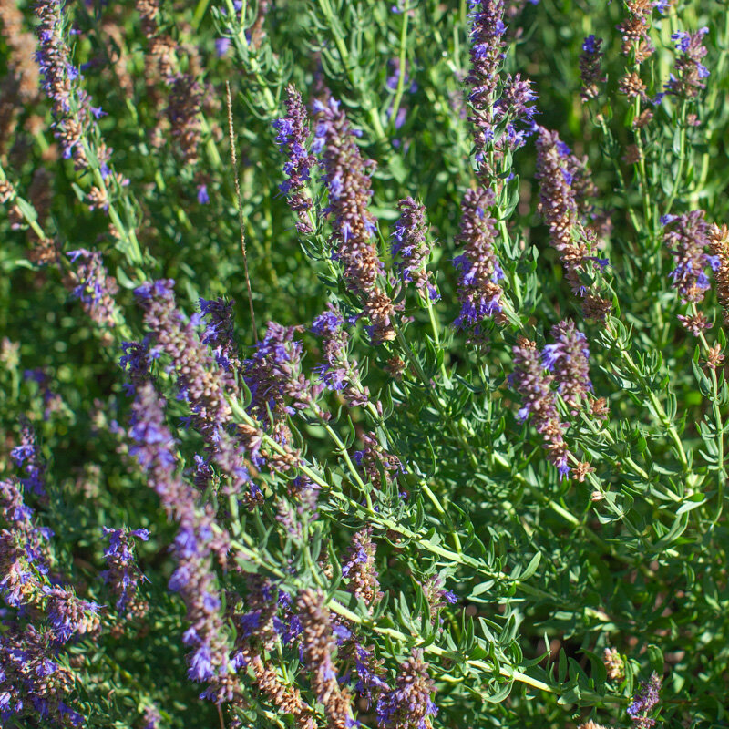 Cette espèce vivace, fortement aromatique et médicinale, forme un arbrisseau aux fines feuilles et aux belles inflorescences garnies d’une multitude de petites fleurs bleu-violet très mellifères.