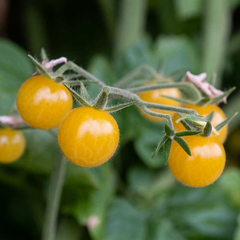 Cette variété, pouvant atteindre plus de 2m de haut, produit toute la saison de petits fruits couleur “champagne” regroupés en grappe. Ces tomates, entre le type “groseille” et “cerise”, offrent un goût très sucré.