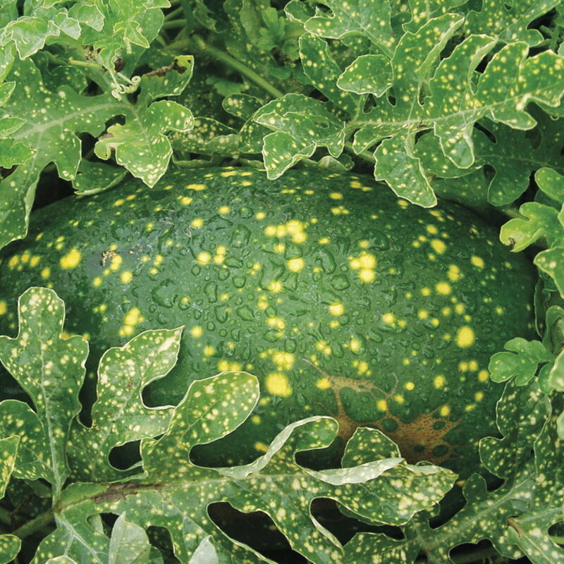 Cette variété est appelée “la lune et les étoiles” car la peau de ses fruits est tachetée de formes jaunes vives et irrégulières. Les feuilles sont également tachetées de jaune. Les fruits ont une forme ovale et pèsent de 7 à 14 kg. La chair est rouge vif et très sucrée. Une des plus belles variétés de pastèques. Croissance: 95 jours.