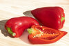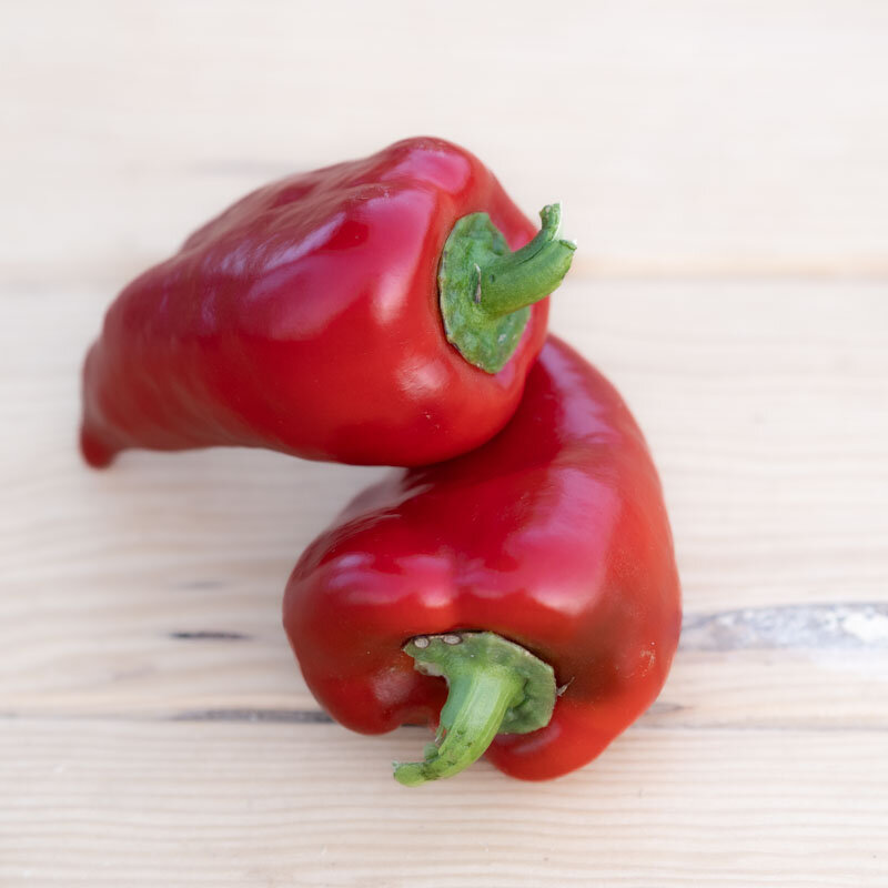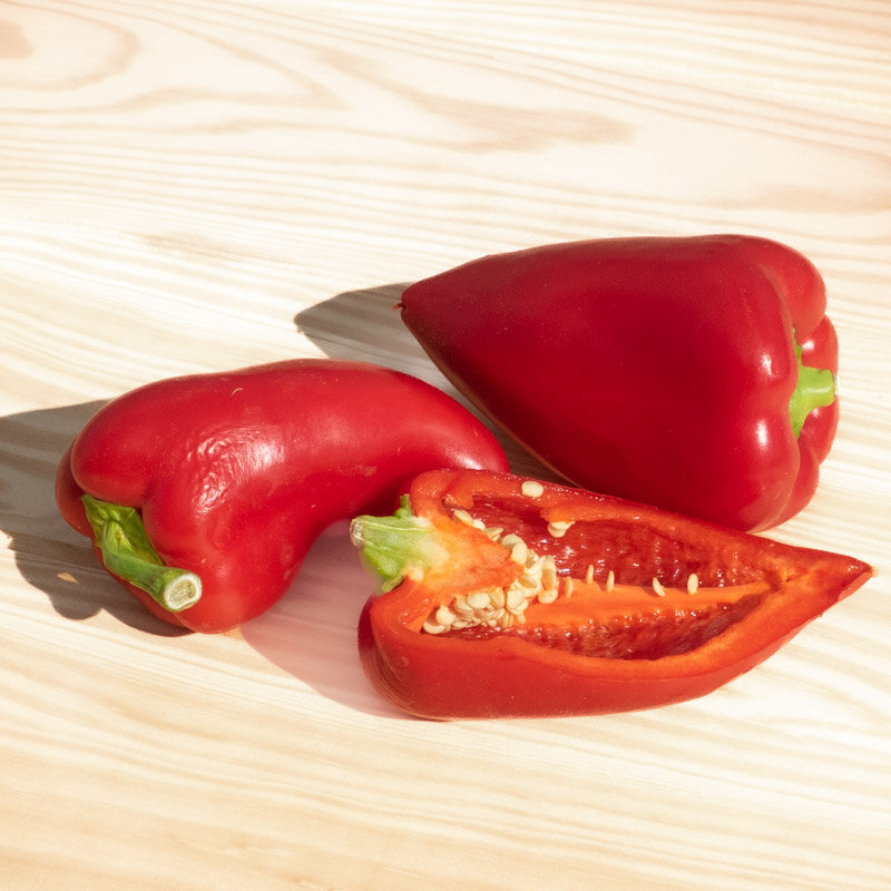 Cette variété résistante offre des fruits allongés et pointus, à l’allure de cœur, de 8 à 10 cm de long. Ils murissent du vert au rouge profond et dévoilent une chair épaisse, très juteuse, à la saveur riche rappelant celle de la pomme.