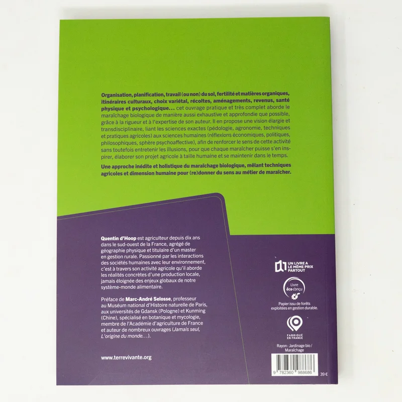 Une approche inédite et holistique du maraîchage biologique, mêlant techniques agricoles et dimension humaine pour (re)donner du sens au métier de maraîcher. Organisation, planification, travail (ou non) du sol, cultures et choix variétal, récoltes, aménagements, revenus, santé physique et psychologique… cet ouvrage aborde le maraîchage biologique de manière élargie et transdisciplinaire, approfondissant ses différents aspects, afin d’en renforcer le sens, sans entretenir les illusions, pour que les projets agricoles à taille humaine réussissent à se maintenir dans le temps