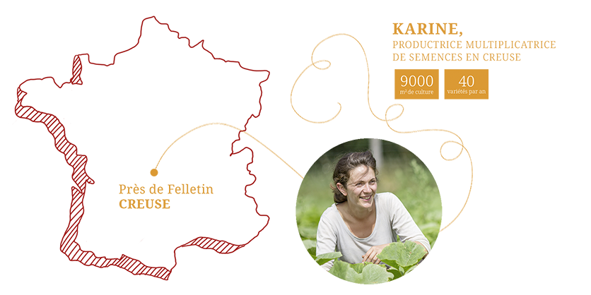 « La ferme, située à 700 m d’altitude, offre un sol sablonneux et riche régulièrement arrosé, grâce au forage, et protégé par un mélange de fumier et de sciure locale. C’est une ancienne terre d’élevage familiale, préservée de la chimie, que j’ai eu la chance de pouvoir acheter en 2015. En premier lieu avec une double activité de maraîchage et de production de semences, je me suis ensuite consacrée uniquement à la semence et multiplie maintenant plus de 40 variétés par an.